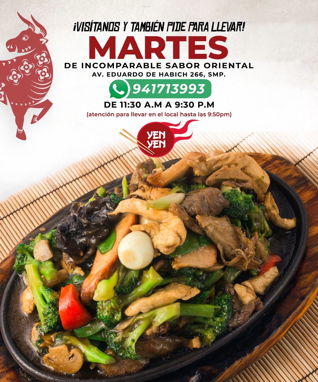 Para tus reservas o consultas, no dudes en llamarnos al 51 994 619 754. Ven y vive una experiencia gastronómica única en Chifa Yen Yen, donde cada bocado es un viaje a las raíces de la cocina fusión. ¡Te esperamos!